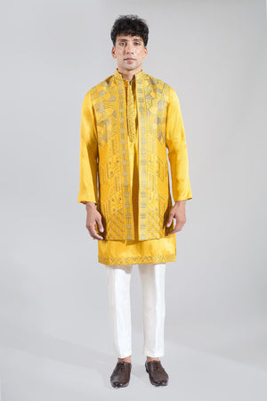 Yellow crepe silk based long open jacket enhanced with resham embroidery, paired with a matching kurta and an off white dupion silk based pants.