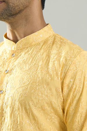 Yellow cotton silk based kurta enhanced with all over chikankari embroidery, paired with an off white dupion silk based pants.