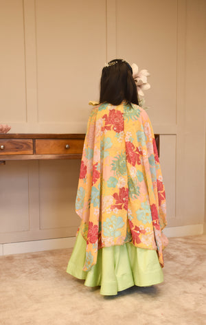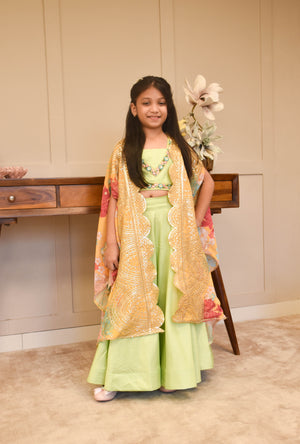 Explore our girls green crop top with pant and printed cape ensemble, featuring a comfortable cotton silk crop top with multi-colour embroidery laces for a stylish touch. The flair pants add a trendy flair, while the georgette printed embroidery cape completes the look with elegance. This lightweight ensemble is perfect for haldi or mehendi functions, allowing your little one to shine with grace and charm.