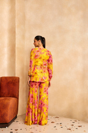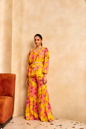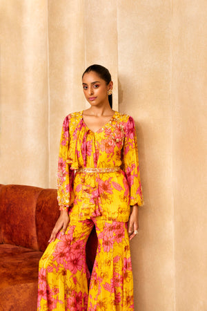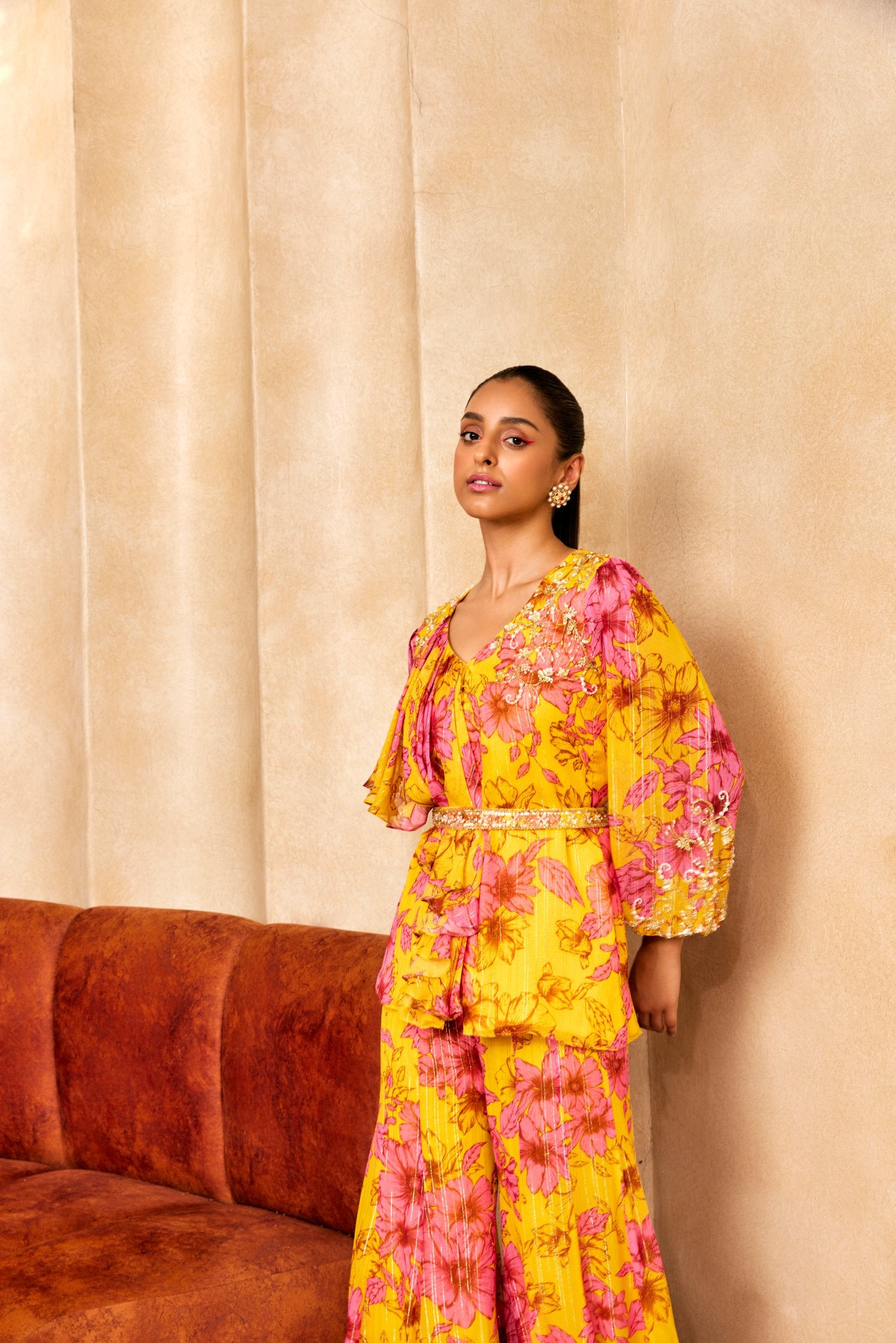 Yellow And Pink Floral Printed Kurta In Georgette Fabric With Shimmer Lurex Stripes. It Has A Ruffle Detailing, Hand Embroidery At The Neckline And Sleeves As Well As A Hand Embroidered Belt Secured With Ties.