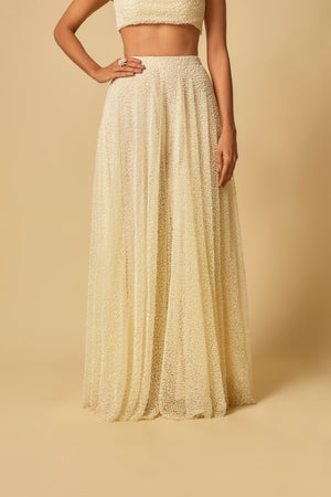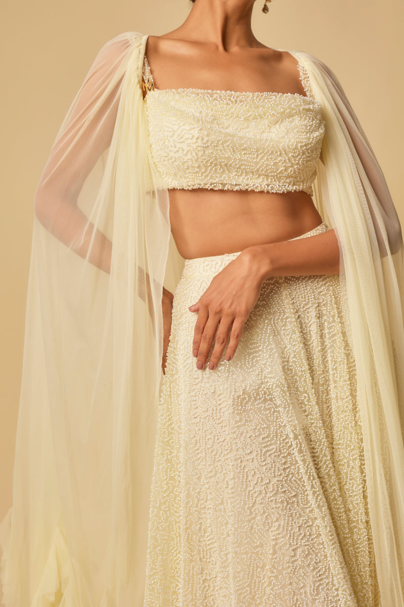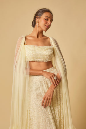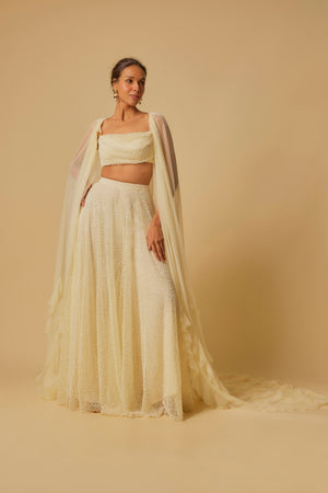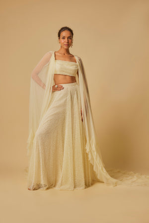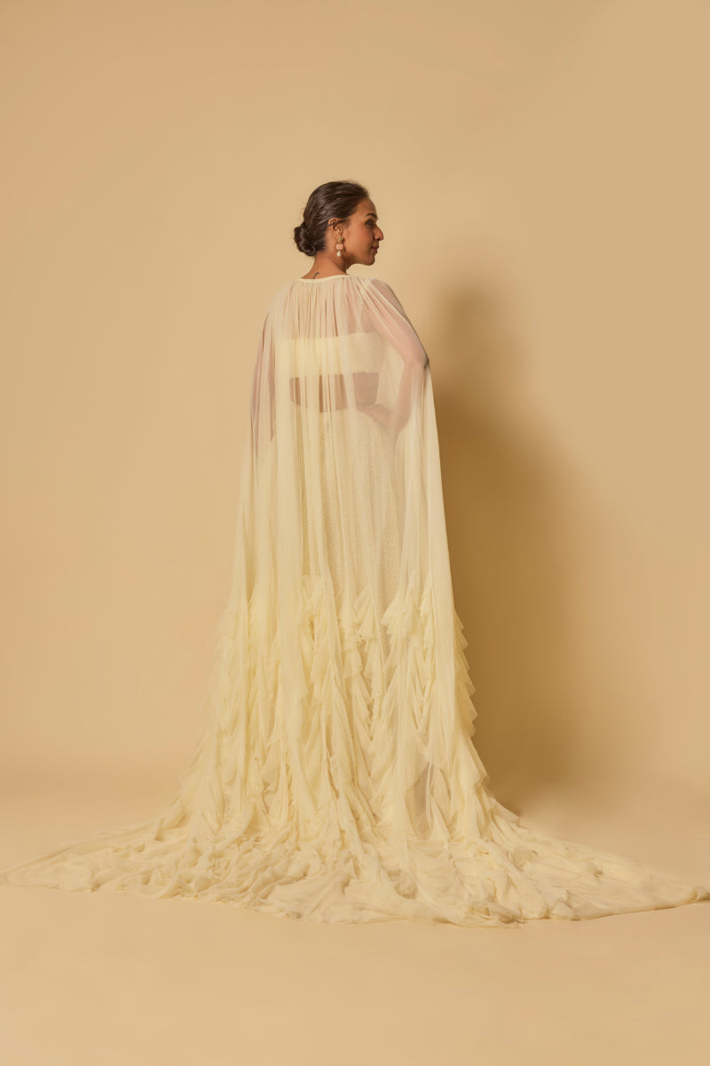 featuring yellow heavy embroidered gharara pant in tulle with matching drape blouse and ruffle cape in tulle