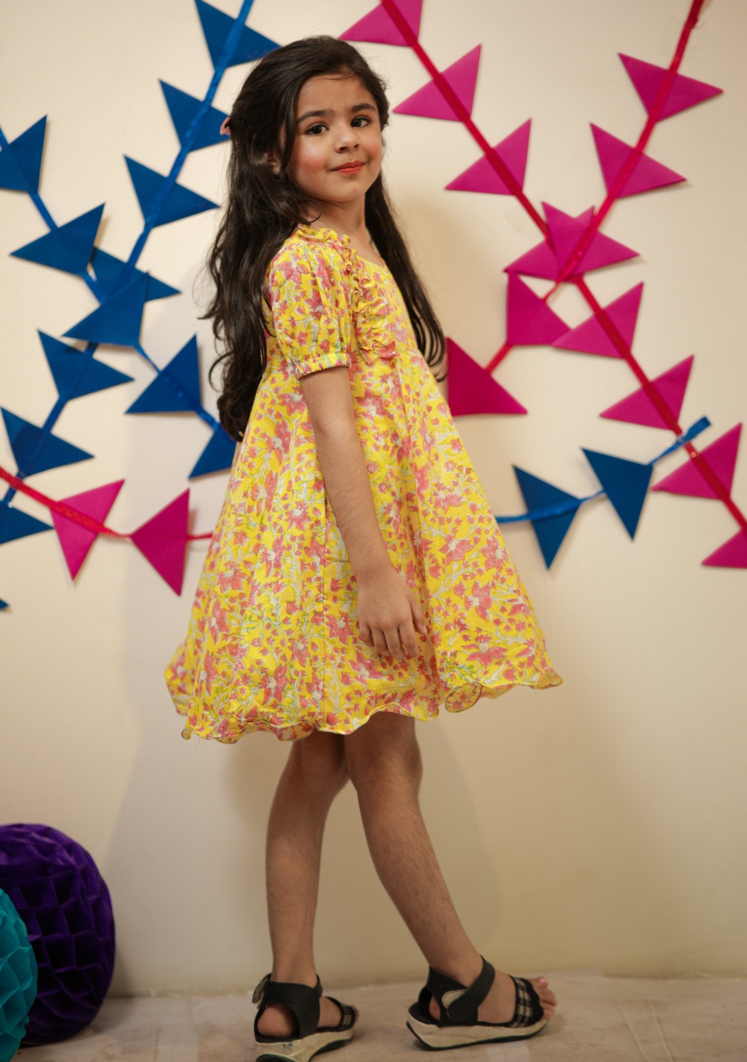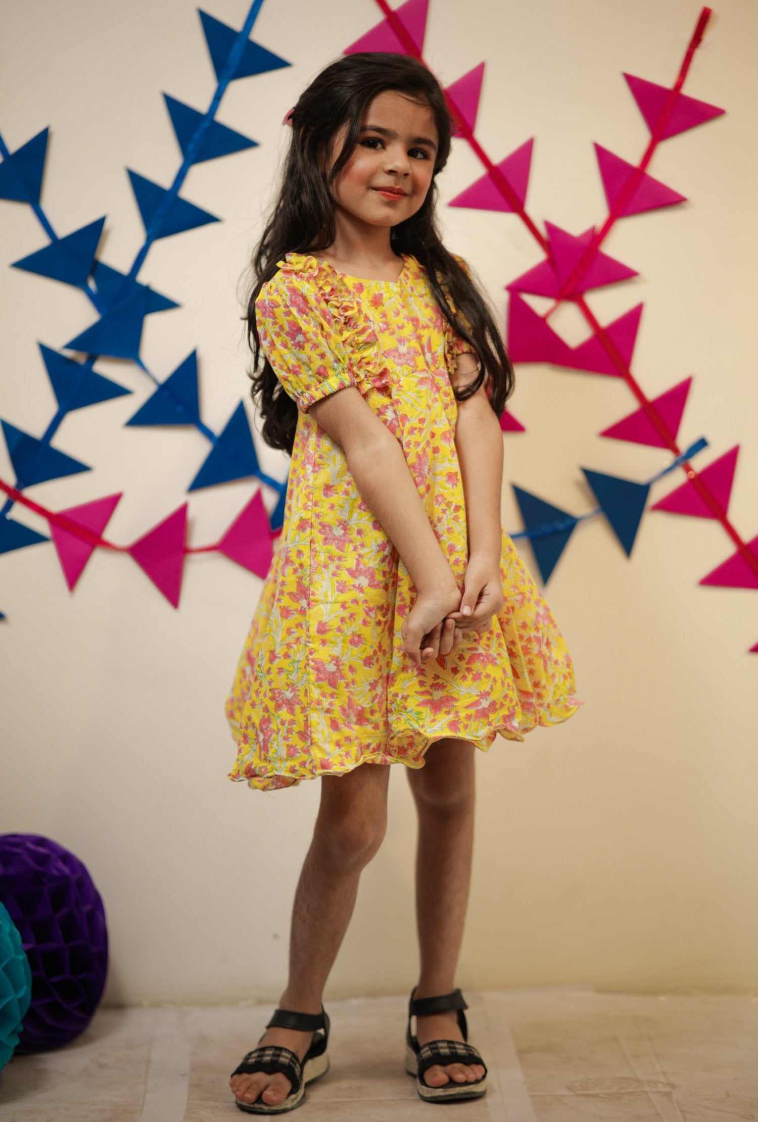 Block printed Frock. Puff sleeves with ruffle detailing