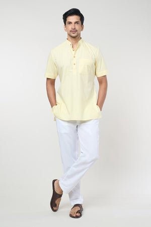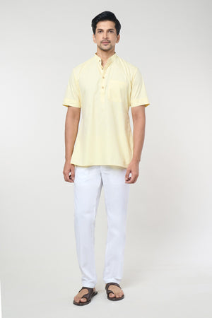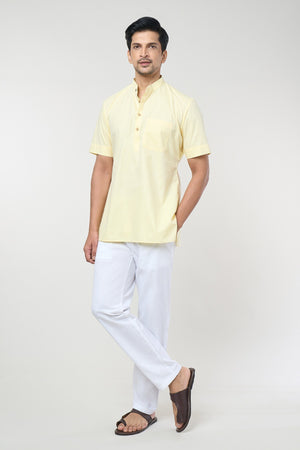 Yellow cotton based, half sleeves, shirt style, solid kurta, enhanced with wooden buttons paired with an off white cotton based mexican pants