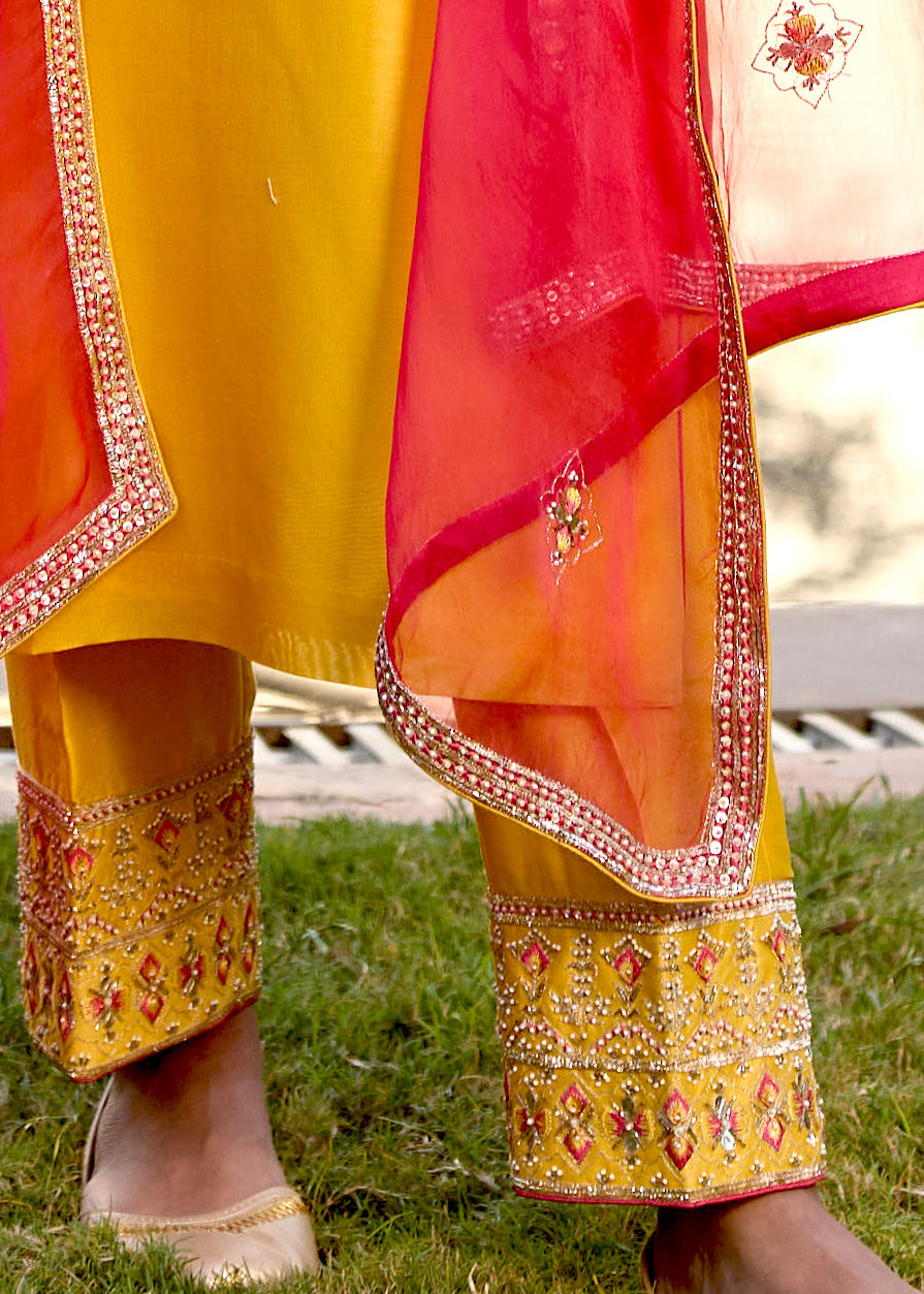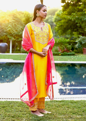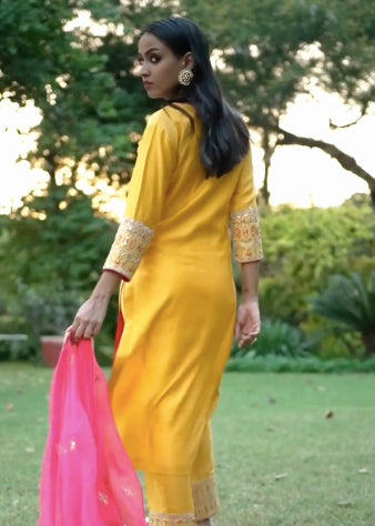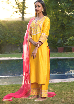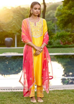 Yellow Pink Hand Embroidered Silk Kurta Set