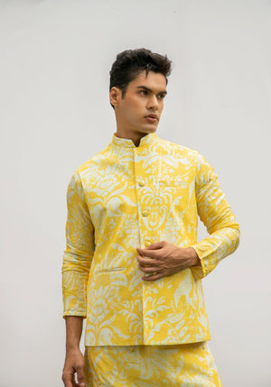 Yellow Print Mirror Kurta Set With Yellow Printed Bundi