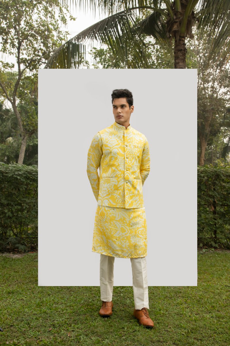Yellow printed mirrorwork kurta along with a graceful printed bundi has been paired with pant pajama.Kurta length- 42", Bundi length- 29" .The color may slightly vary due to screen lighting.
