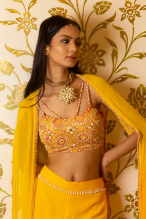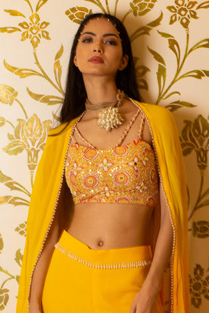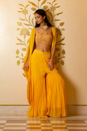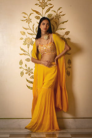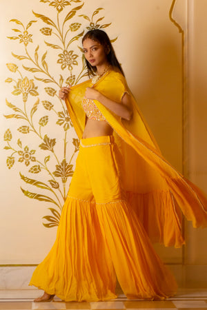 Yellow sharara set comes with embroidered blouse with sharara and an organza shrug. The blouse and shrug are embellished with mirror, moti and dabka work.