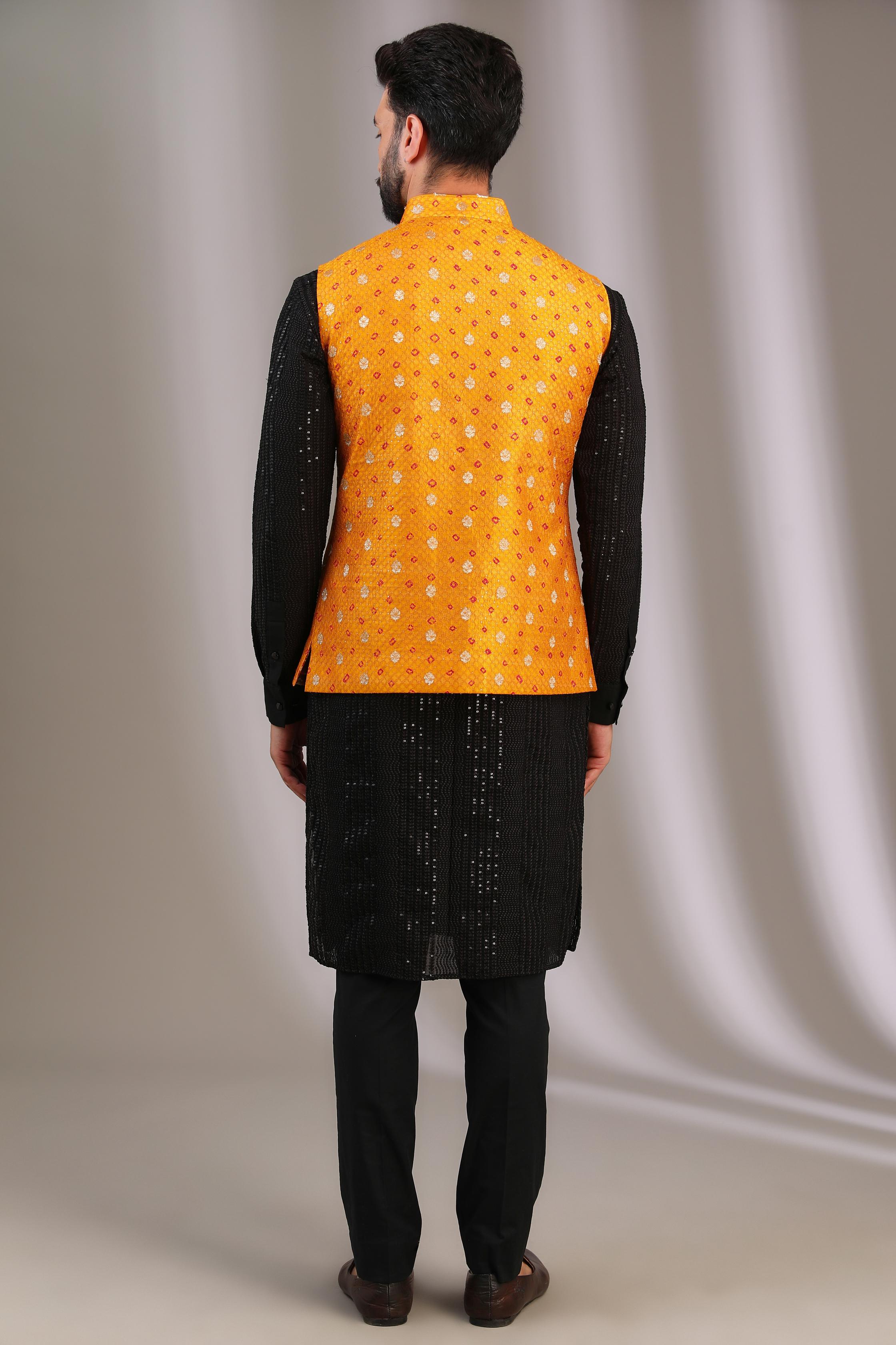 YELLOW SILK WITH SILVER/RED BOOTI + SEQ. WORK BUNDI