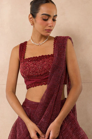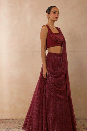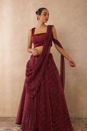 Bold and effortless — this maroon lehenga features a fluid drape with an attached dupatta for ease and edge. Paired with a hand-embroidered blouse, it’s the perfect blend of comfort, glamour, and statement-making style.