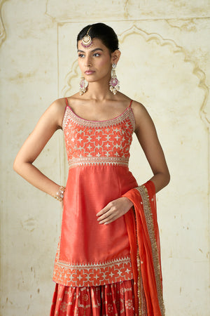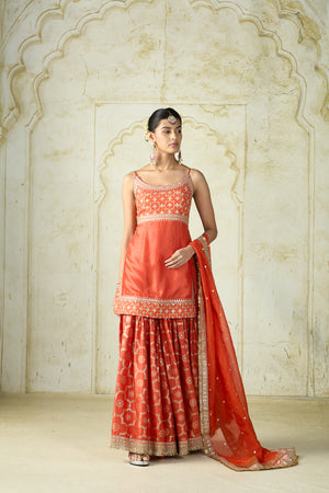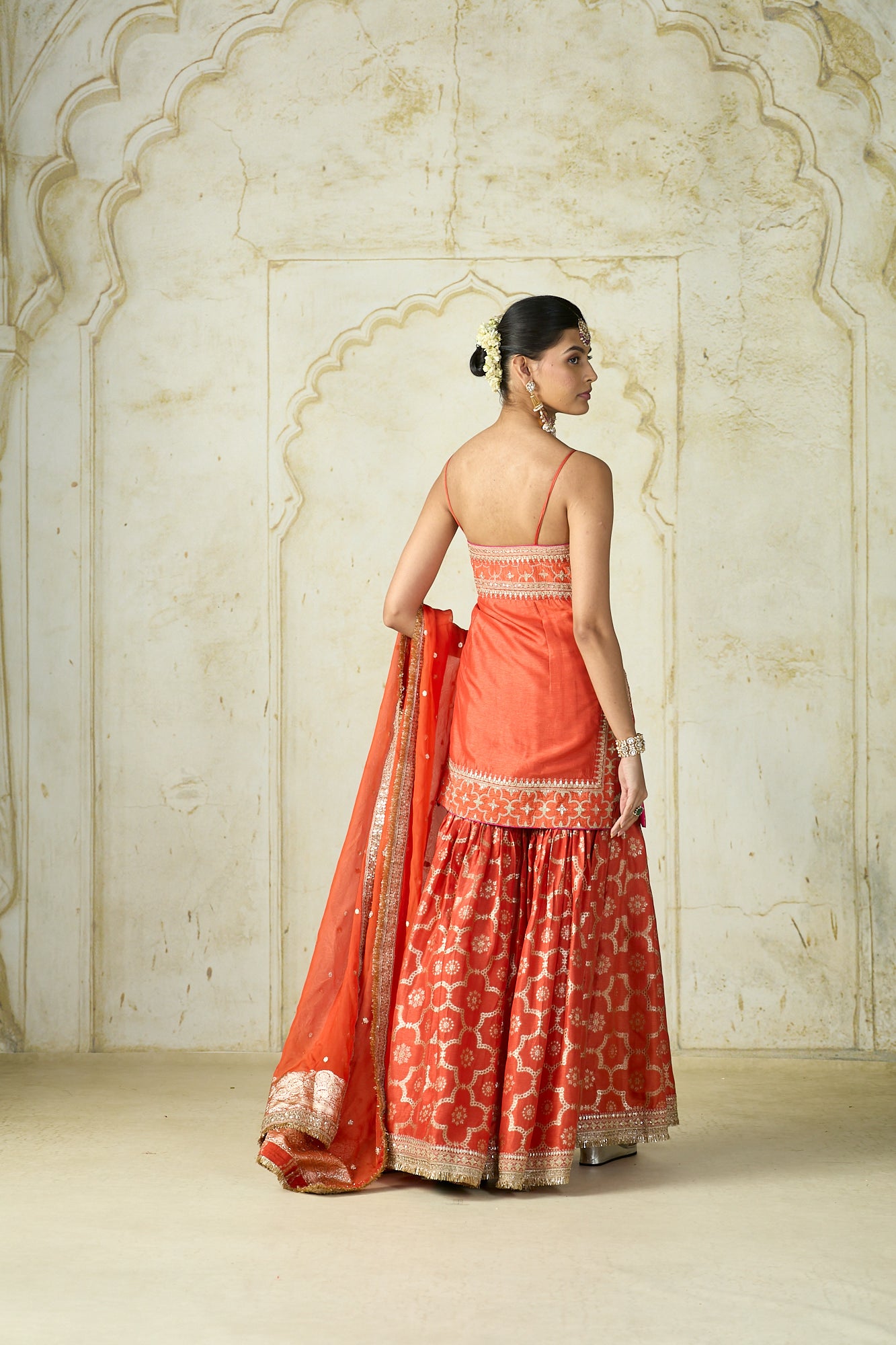 This vibrant traditional ensemble radiates festive elegance with its youthful silhouette. The sleeveless kurta is adorned with delicate embroidery on the neckline and waistline, paired with a sharara featuring intricate woven patterns and a richly embellished hem. The look is completed with a sheer dupatta.