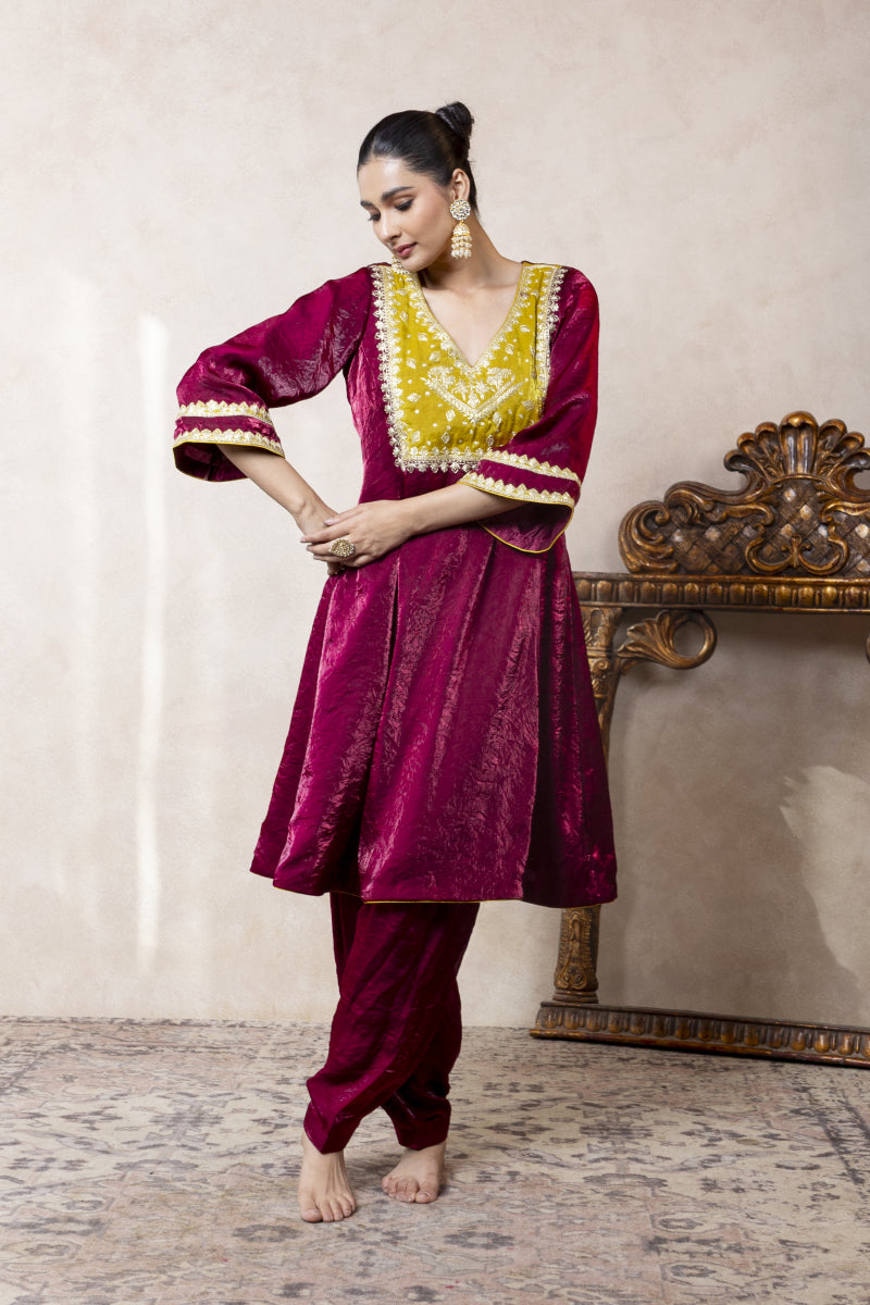 Rooted in tradition with a contemporary twist — this wine choga set features intricate embroidery that adds richness to its relaxed silhouette. A timeless pick for festive elegance and effortless charm.