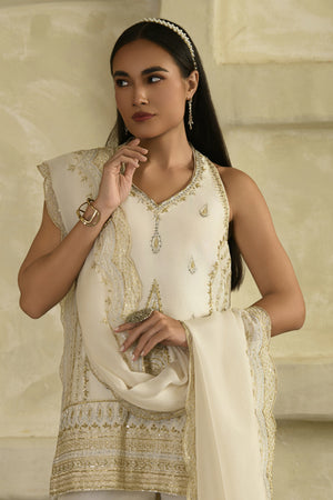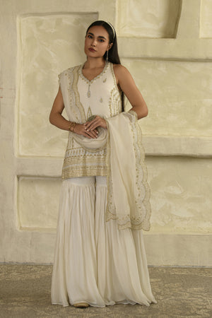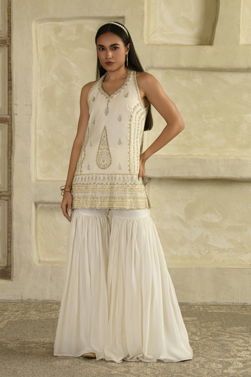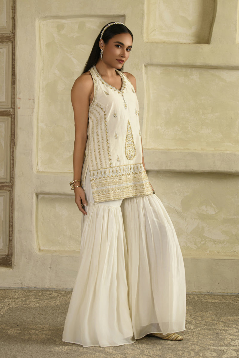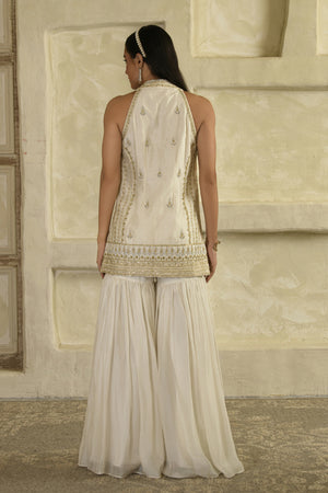 Fall for the intricate details with this white aari hand work chanderi silk halter neckline kurta with pleated garara and organza dupatta.The white kurta comes with aari and zardozi work.This kurta is paired with matching silk garara .This set is complimented with a organza dupatta with delicate hand embroidery