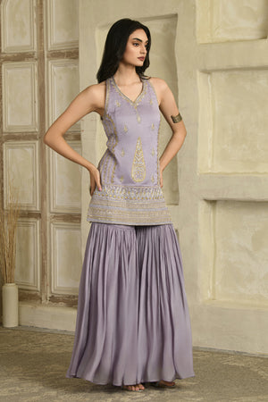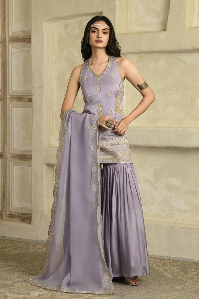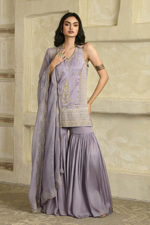 Fall for the intricate details with this lilac aari hand work chanderi silk halter neckline kurta with pleated garara and organza dupatta.The lilac kurta comes with aari and zardozi work.This kurta is paired with matching silk garara .This set is complimented with a organza dupatta with delicate hand embroidery