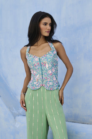 Ombre sequence embellished flared pant paired with colorful threads, glass beads , sequence and Zari embroidered halter neck top.