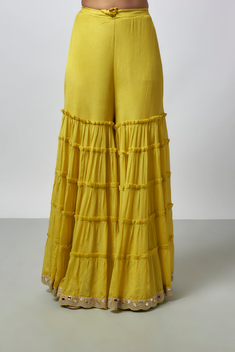 The fitted, long-sleeve peplum-style kurta features intricate mirror work and delicate embroidery.Paired with tiered sharara pants adorned with subtle embellishments and ruffle details, this outfit offers a playful yet graceful silhouette.