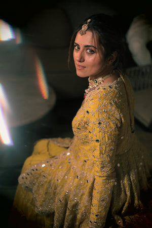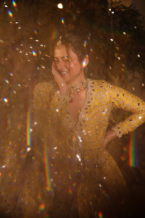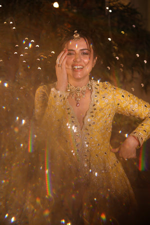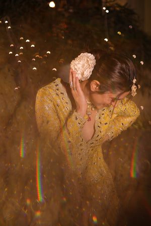 The fitted, long-sleeve peplum-style kurta features intricate mirror work and delicate embroidery.Paired with tiered sharara pants adorned with subtle embellishments and ruffle details, this outfit offers a playful yet graceful silhouette.