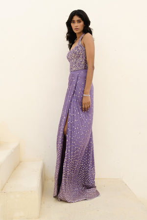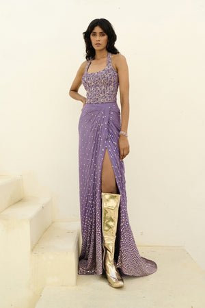Sequence embellished trail drape skirt paired with sequence and glass beads embroidered halter top.