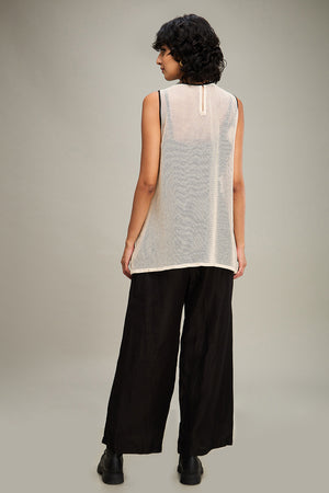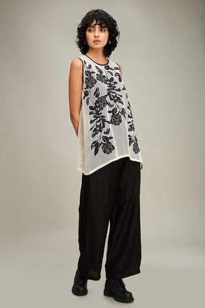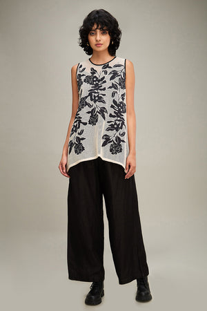 Off-white Zinnia Appliqued Sleeveless Top with handloom net, paired with black flared pants in chanderi.