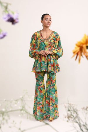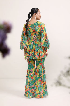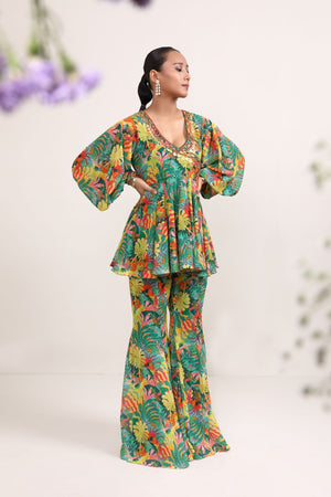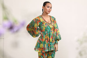 The outfit features vibrant and colorful tree-inspired prints. The Angrakha design, characterized by its overlapping front panels represents fusion. The outfit is paired with a flared pants