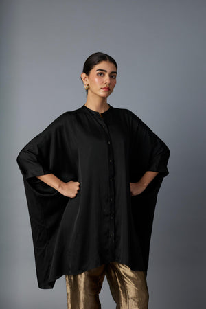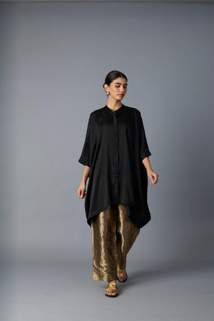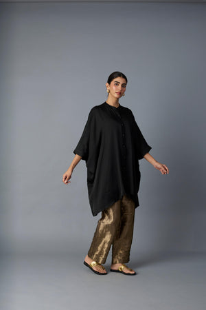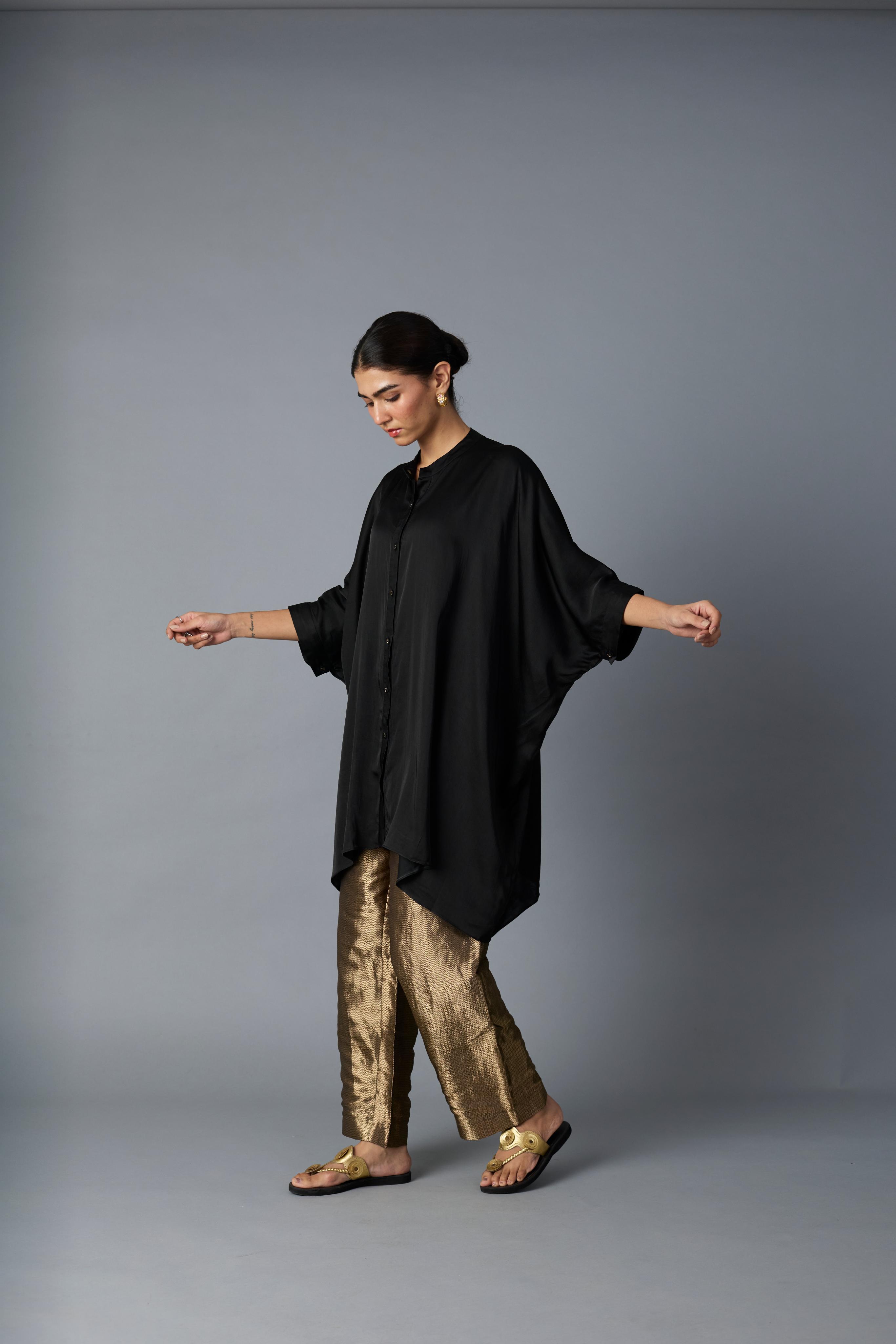 The Zoha anti- fit shirt in black modal satin offers a sleek and sophisticated oversize silhouette for effortless style. Crafted from smooth, breathable fabric, it pairs perfectly with our Chamkila pants crafted from luxurious Banarasi twill sari, creating a refined blend of contemporary and traditional elements. Available in multiple color variants to suit your wardrobe needs.