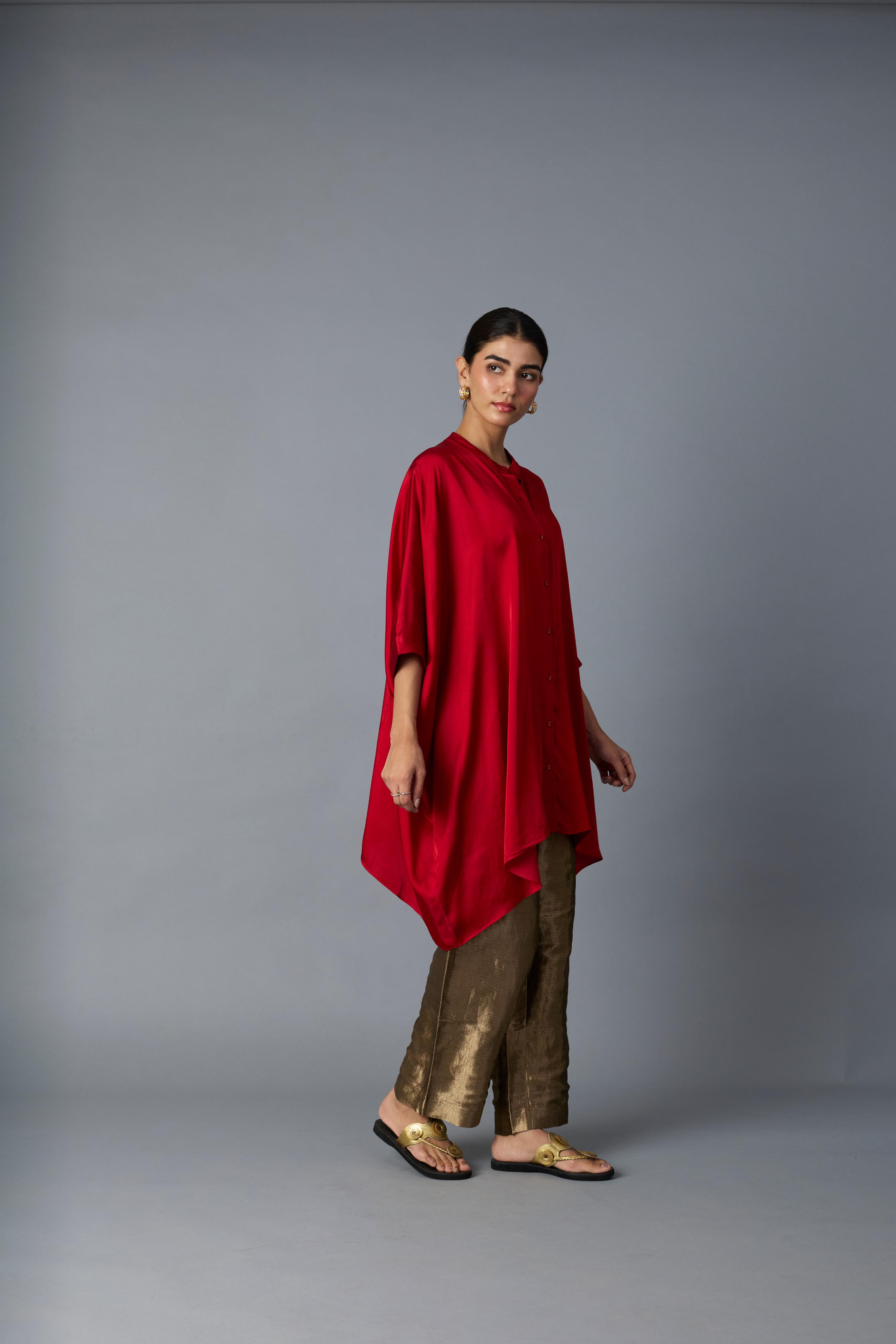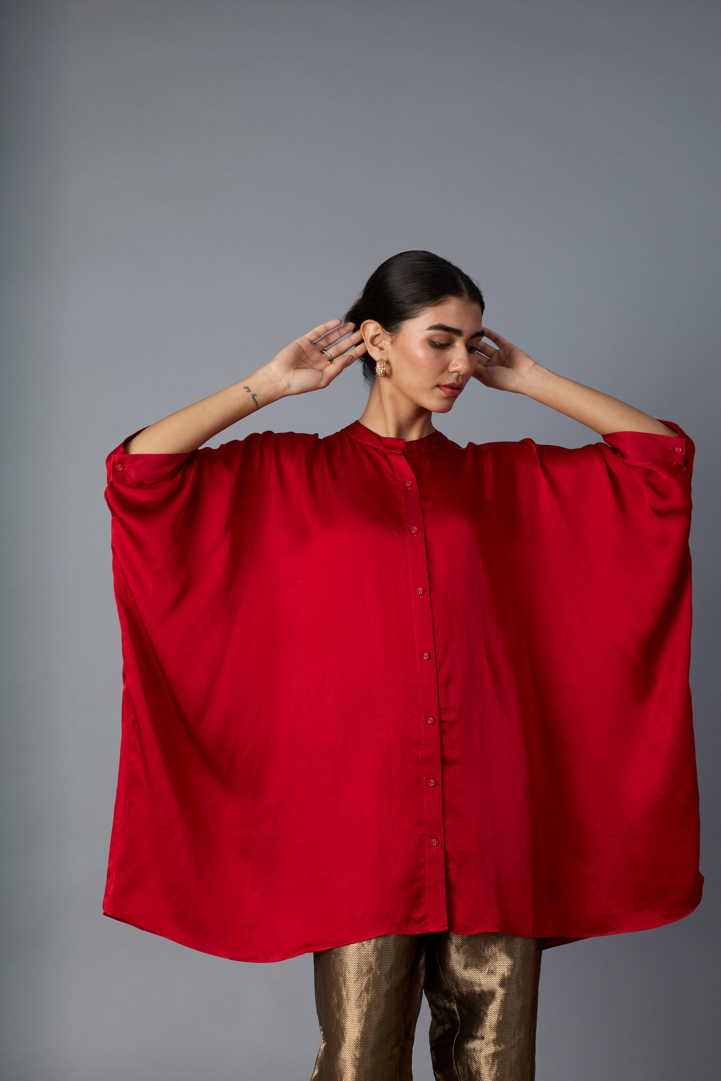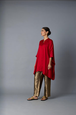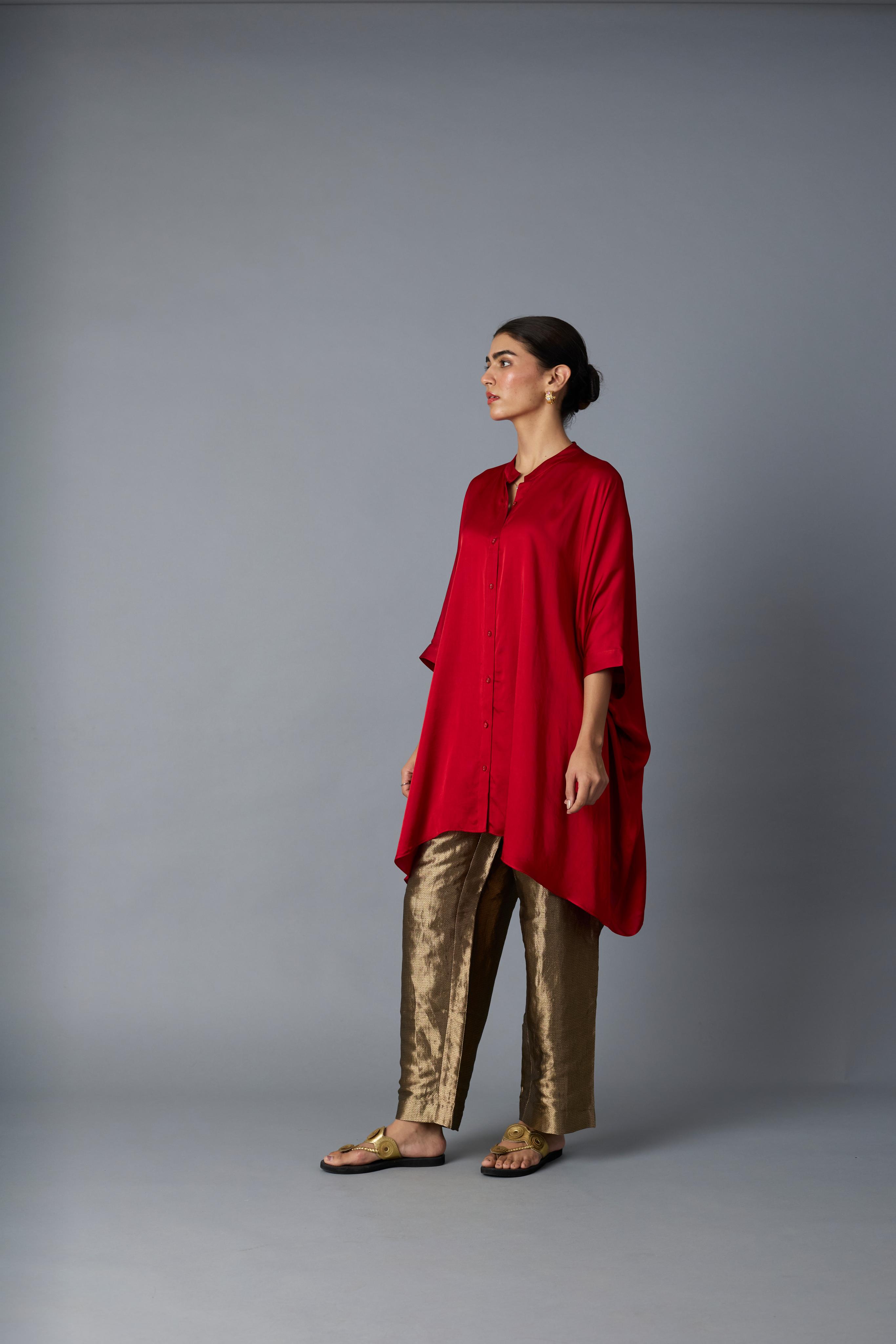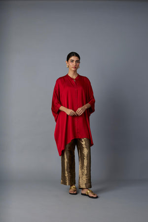 The Zoha anti- fit shirt in red modal satin offers a sleek and sophisticated oversize silhouette for effortless style. Crafted from smooth, breathable fabric, it pairs perfectly with our Chamkila pants crafted from luxurious Banarasi twill sari, creating a refined blend of contemporary and traditional elements. Available in multiple color variants to suit your wardrobe needs.