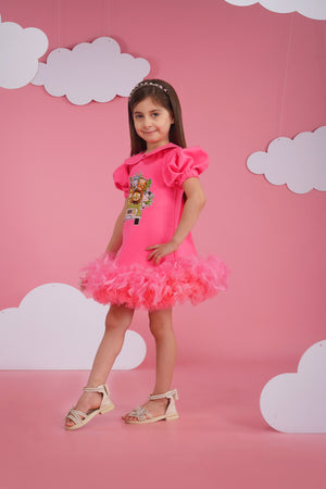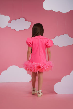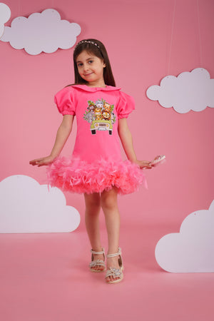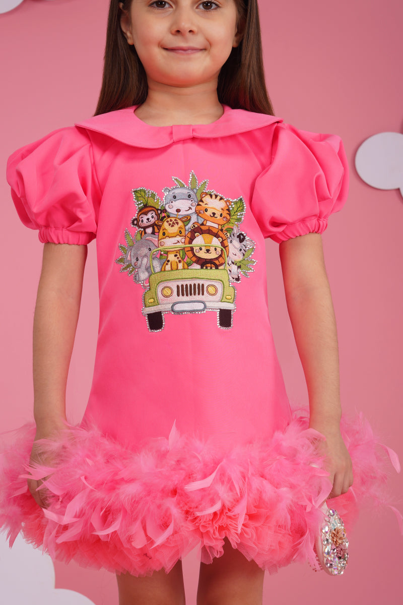 A beautiful pink luxury crepe dress with amazing animal embroidery, feather and tulle frilling in the bottom anf puffy sleeves