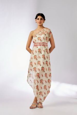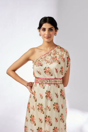 Using bold floral in happy colours, is the perfect choice for any day! This one shoulder gown is stylish and comfortable, with drape and enhanced neckline that gives a feminine feel. with waist belt.