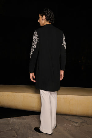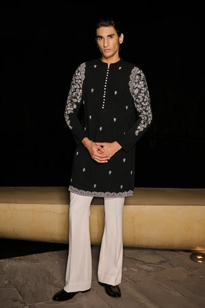 Kurta heavily embellished on sleeves with intricate resham work, with abstract paisley motifs, paired with white pants